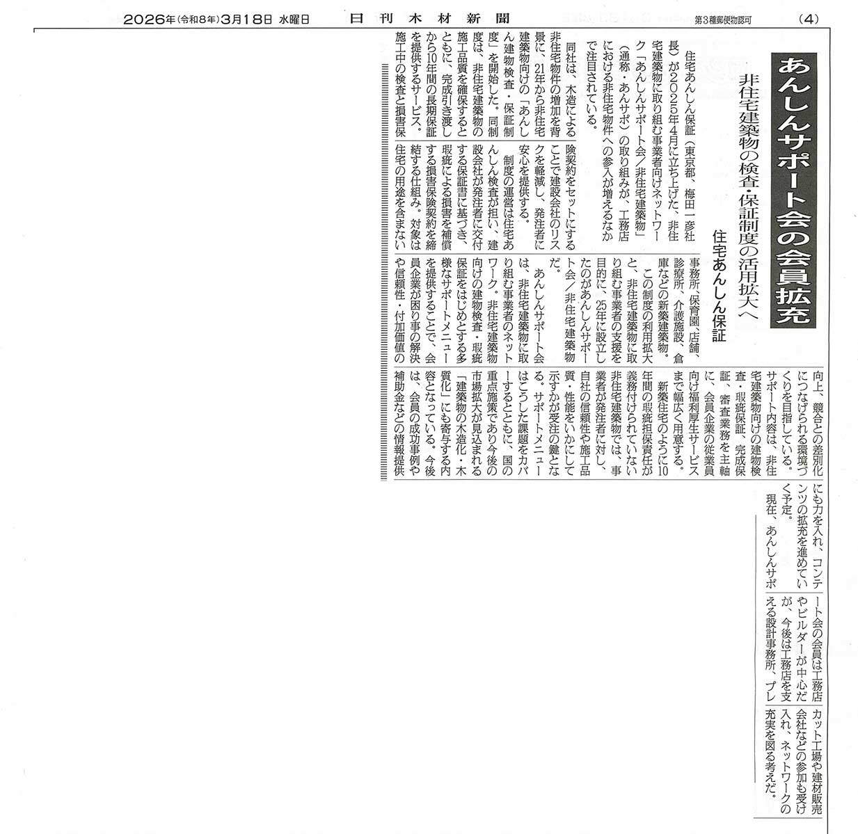 2026年3月18日付の日刊木材新聞4面「あんしんサポート会の会員拡充 非住宅建築物の検査・保証制度の活用拡大へ」と題した記事で、住宅あんしん保証が立ち上げた「あんしんサポート会/非住宅建築物」の取組みが紹介されました。(画像をクリックすると大きく表示されます。)